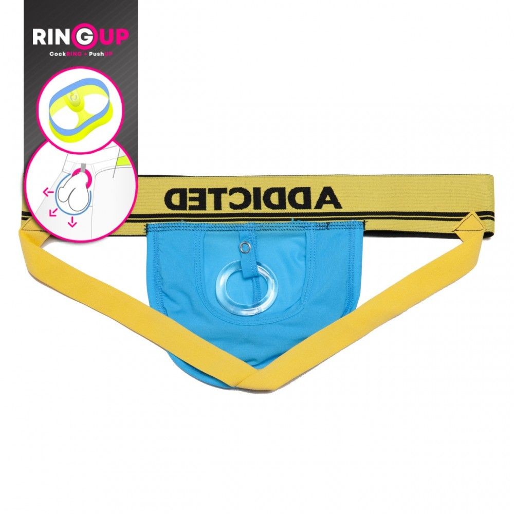 Revolutionary push-up jockstrap with detachable erection ring by Addicted. Sexy and comfortable, waistband with logo, push-up with ring-up technology.