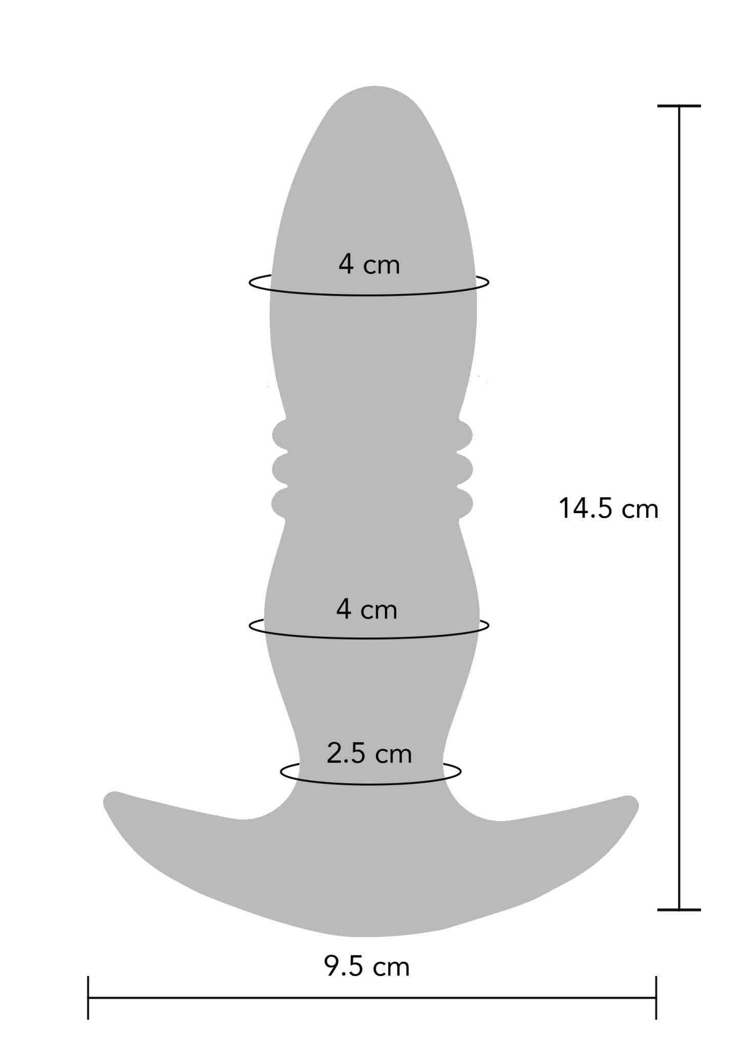 Butt plug with 7 pulsating programs, 3 vibrating speeds, remote control and a thrusting head. Silicone prostate stimulator can be charged via attached USB cable. Total length 15.5 cm, usable length 13 cm, diameter 3–3.6 cm. More Information