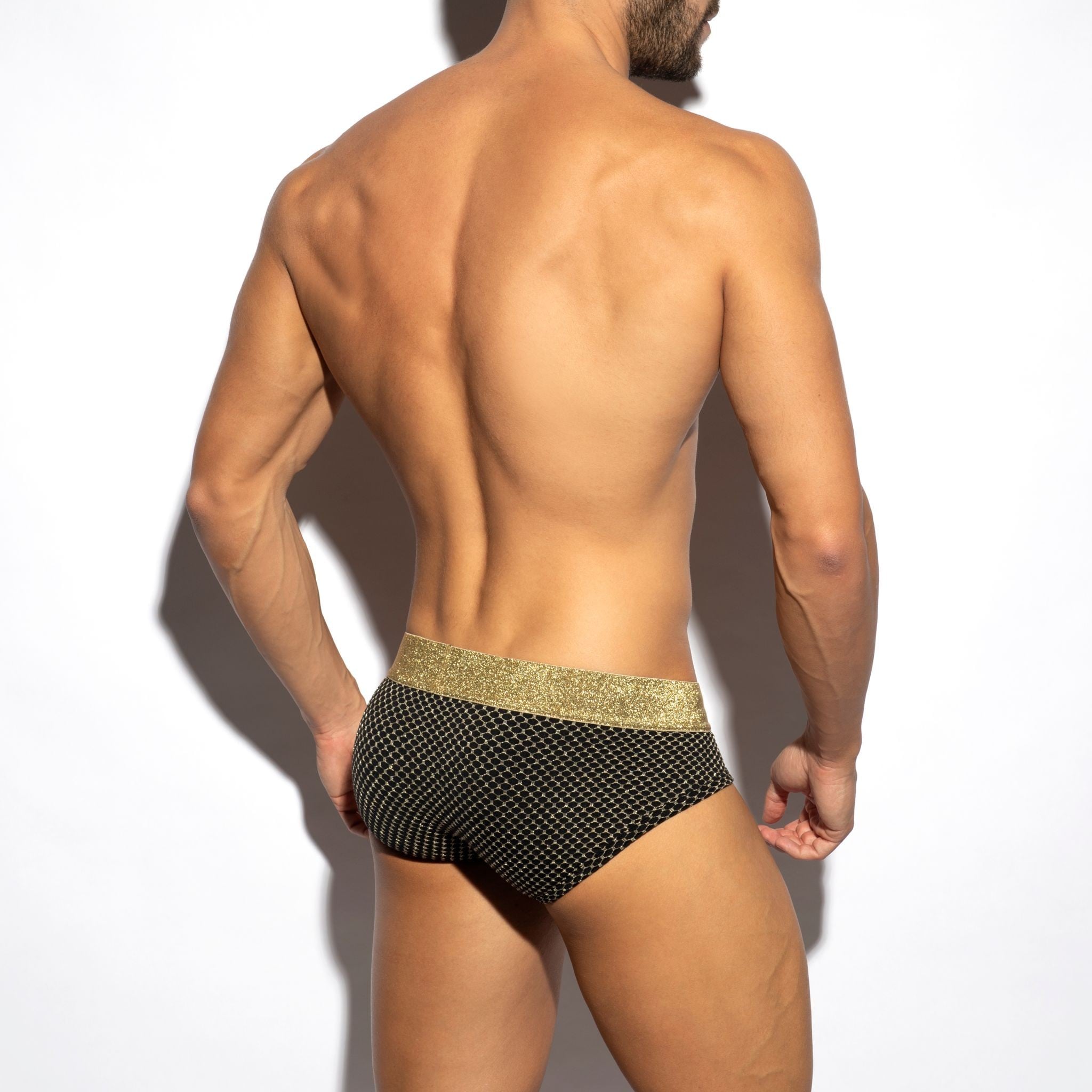 Luxury brief made of outstanding fabric with lurex threads allover contrasting, which forms a pattern of snake scales. Comfortable and elegant design, ideal (not only) for a special occasion. Gold (lurex) waistband with Es Collection logo on the front. Material: 82 % polyamide, 16 % elastane, 2 % polyester.