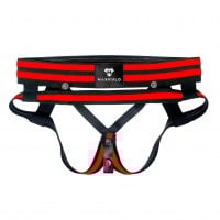 Men’s fetish jockstrap from the Maskulo’s Youngero Generation Y collection. This piece is an attractive combination of red and black colour, leather-looking black spandex and additional bands with straps below the waistband.