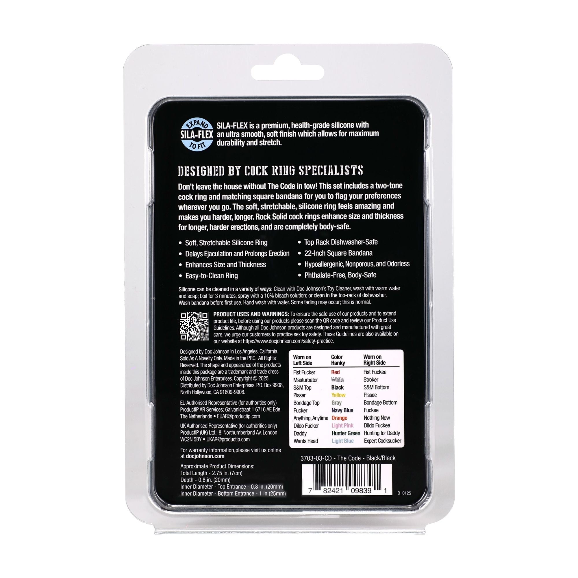 Rock Solid The Code is a stylish and functional set that combines clear communication of preferences with a practical erotic accessory. The package includes a black hanky bandana, which in hanky code signifies SM, and a matching double ring for the penis and testicles.