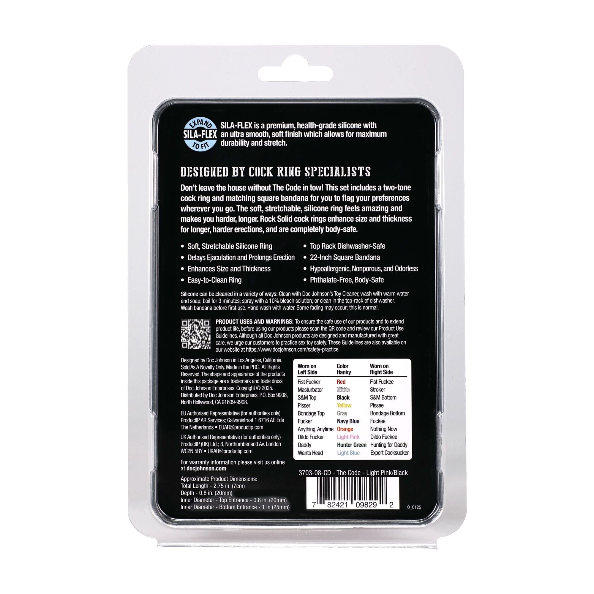 Rock Solid The Code is a stylish and functional set that combines clear communication of preferences with a practical erotic accessory. The package includes a pink hanky bandana, which in hanky code signifies playing with a dildo, and a matching double ring for the penis and testicles.