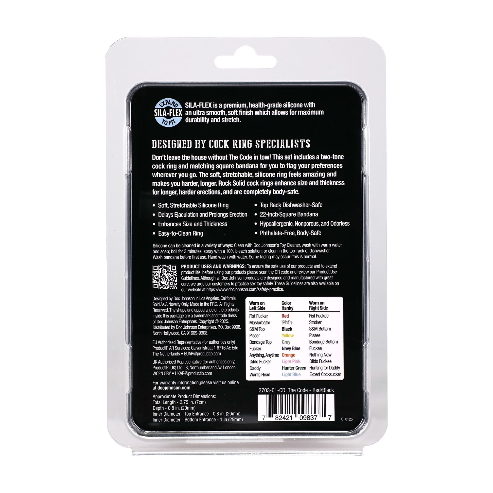 Rock Solid The Code is a stylish and functional set that combines clear communication of preferences with a practical erotic accessory. The package includes a red hanky bandana, which in hanky code signifies fisting, and a matching double ring for the penis and testicles.