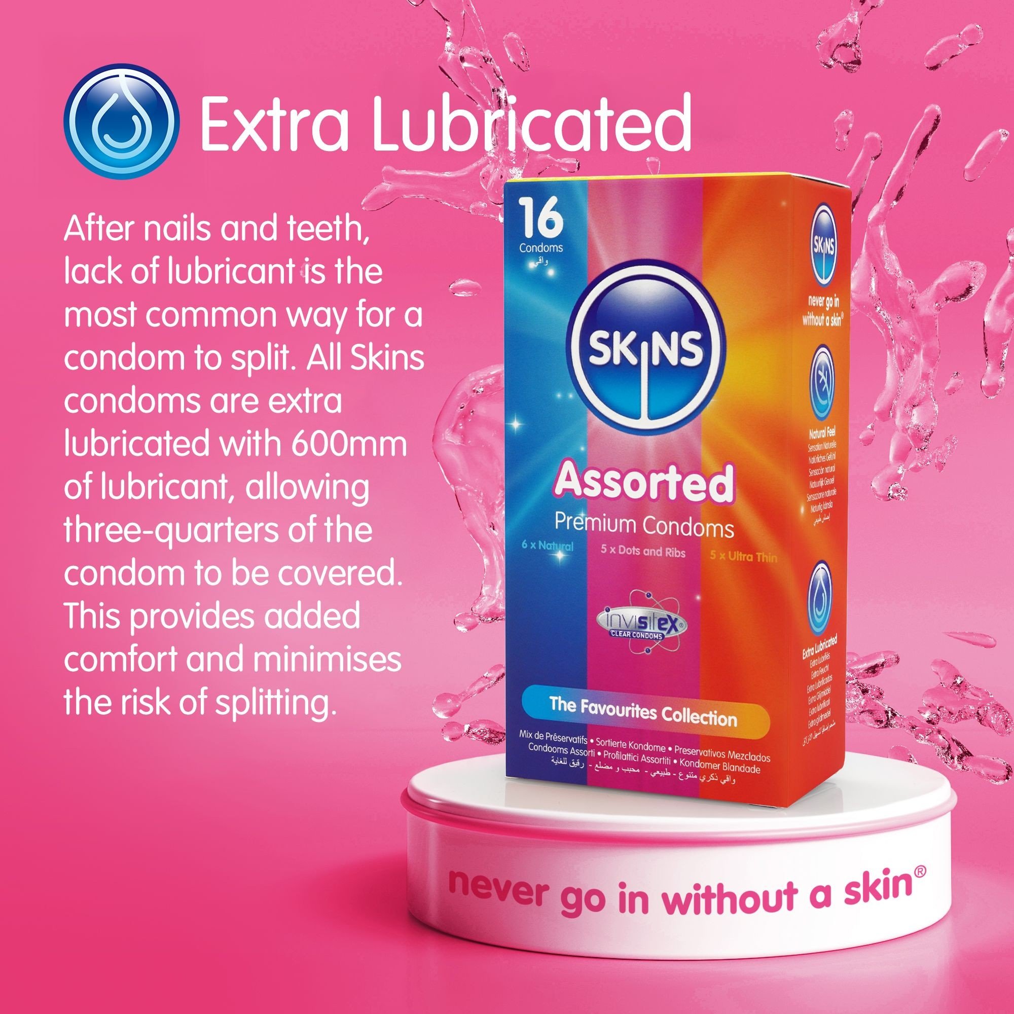 - 1x Skins Ultra Thin – Extra thin condoms for an even more natural feeling during intimate moments. Nominal width 55 mm, length 180 mm.