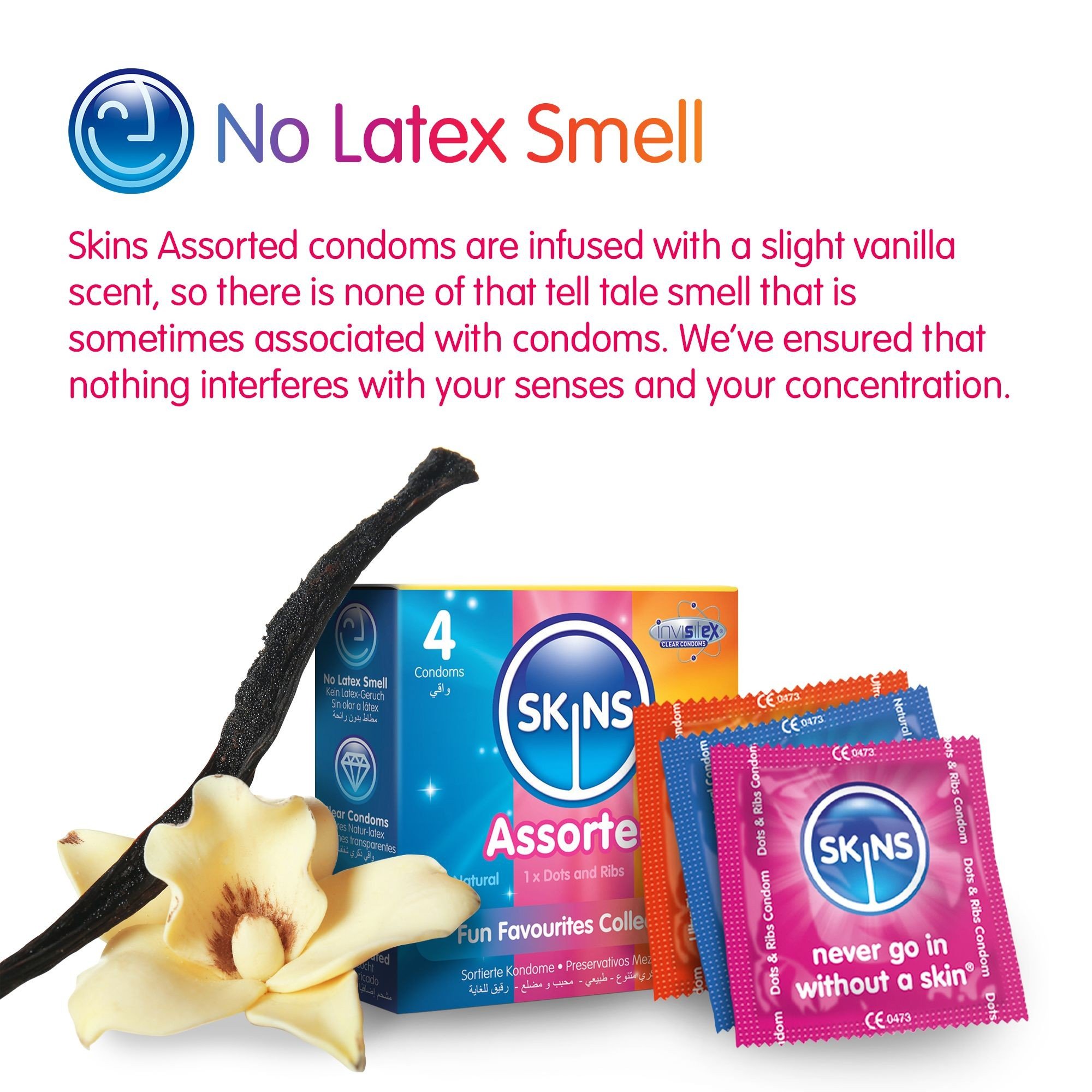 Celebrate diversity with Skins Assorted condoms. The box contains 4 Skins condoms, which are made of high-quality natural latex and feel like a second skin when worn. The transparent design ensures a natural look compared to standard, slightly milky-colored condoms.