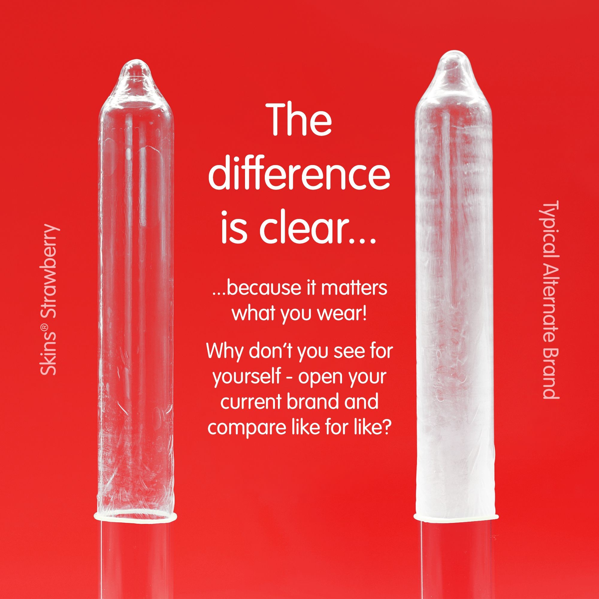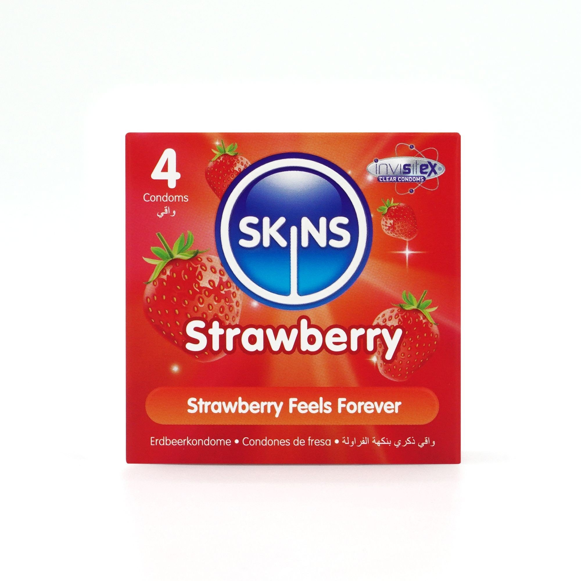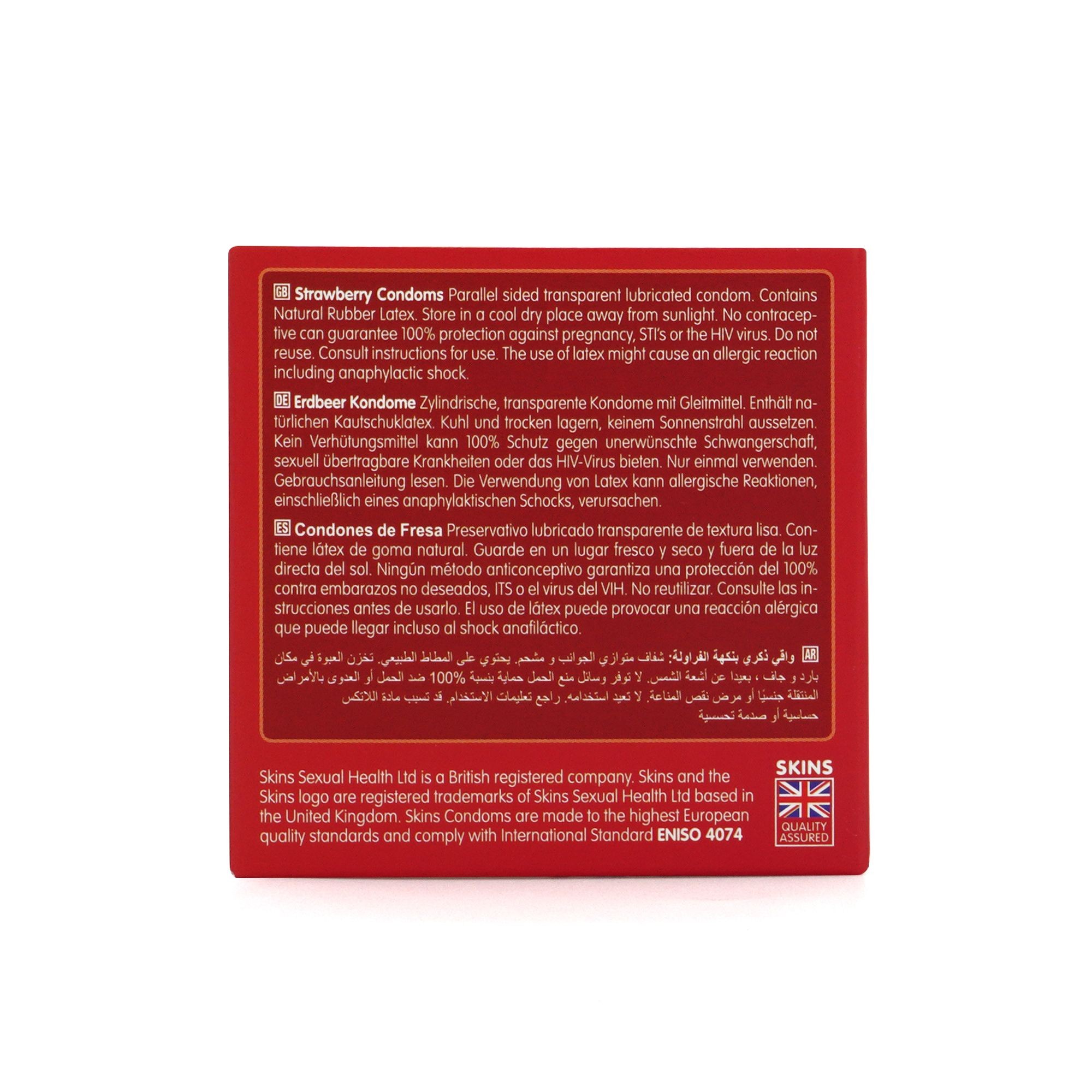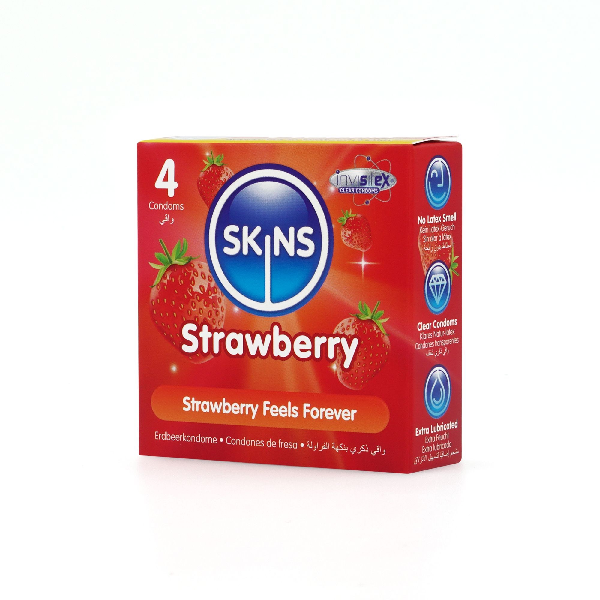 Add a little juiciness to your intimate moments with Skins condoms, which feel like a second skin. The condoms have a strawberry aroma and flavour and do not have the typical latex smell. The transparent design ensures a natural look compared to standard, slightly milky-colored condoms.