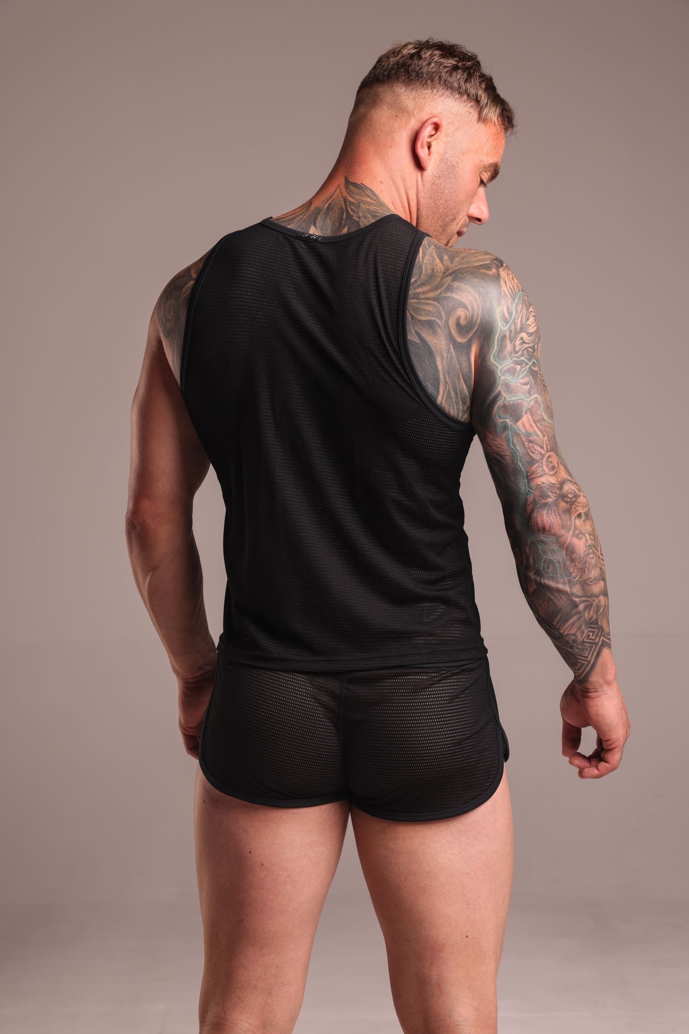 Partially see-through and breathable tank top Sukrew Net Vest. It has a rounded neckline and is slightly shorter than the classic tank to show off the matching Sukrew Net Shorts Nightlife Black you can buy with it. With a silver Sukrew logo on the back.