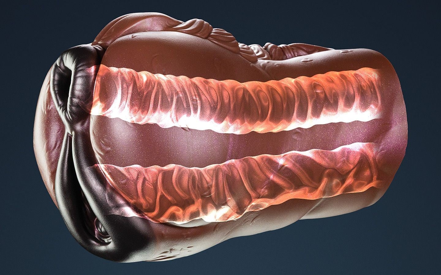 The anal opening starts with a tighter grip, which gradually transitions into a wider chamber with a more pronounced ribbed texture and a slight curve. Ideal for those who like variable pressure and gradual release. The diameter of the opening ranges from 1.1 to 2.5 cm.